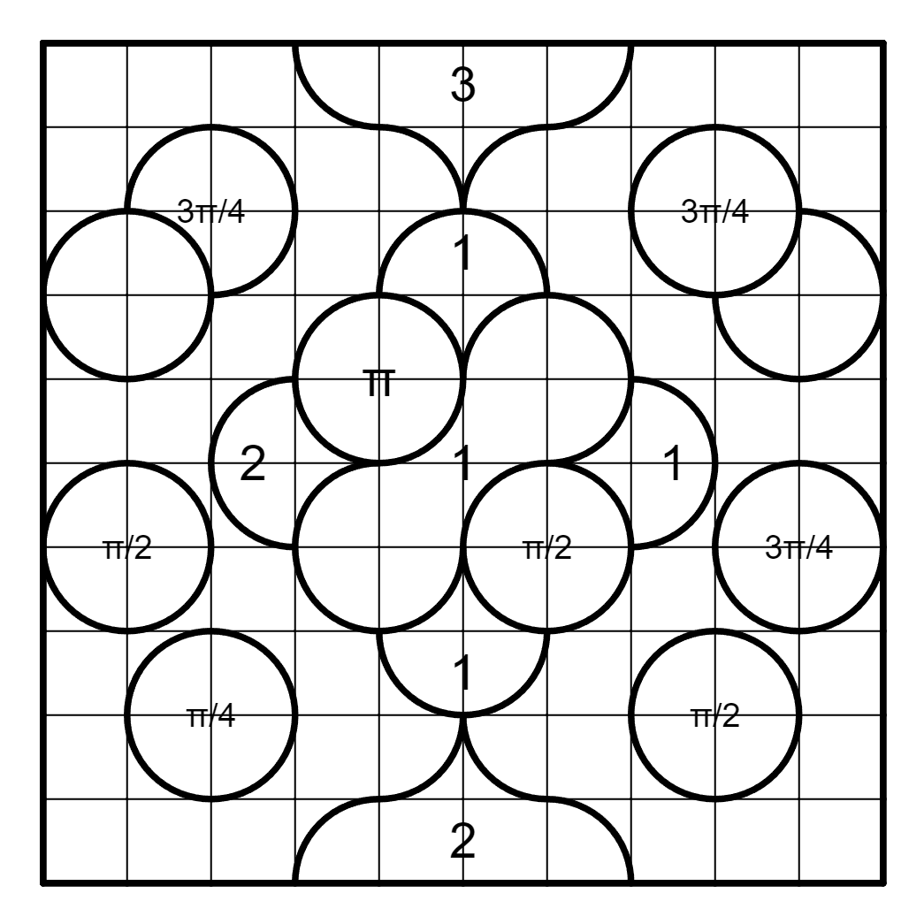 Variant: Arbitrary Regions — The clue regions are not restricted to the grid that is being shaded. Standard Aqre rules apply, except that the numbers indicate the total shaded area in each region (assuming that each cell has an area of 1).