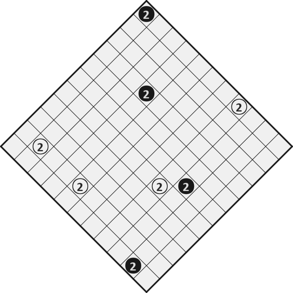 Rules: Shade some cells and divide the remaining cells into squares. Each unshaded square must touch at least one other square or the edge of the grid on each of its lower sides. Squares of the same side-length cannot touch. Cells with black or white circle clues must be shaded or unshaded, respectively. Number clues inside shaded regions indicate the total area of the region. Number clues inside unshaded squares indicate the side-length of the square.